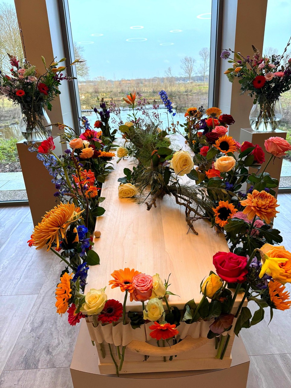 Op de dag van het afscheid stonden ze zelf bij de ingang van het crematorium. Ze ontvingen de gasten zoals je mensen thuis ontvangt. Met een hand, een blik, een arm om een schouder. Hun dierbare stond in de ontvangsthal, omringd door bloemen en zacht licht. Mensen bleven even staan, fluisterden iets, raakten de kist aan, knikten. Het voelde niet als een ceremonie. Het voelde als samen zijn.